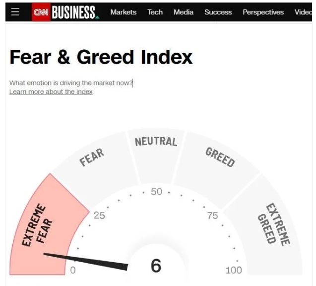現在、CNNの恐怖・強欲指数は6。株式市場は極端な恐怖状態です。