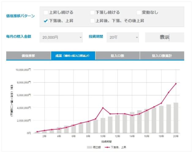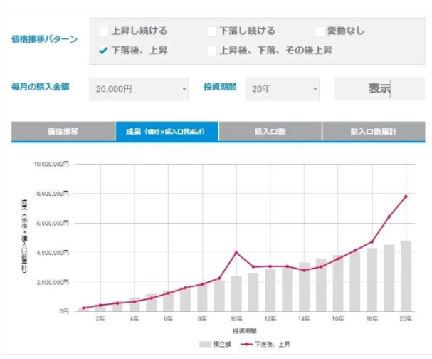 ですので、シミュレーションでは「下落後、上昇」という分類で計算しています。毎月の積み立て額は20,000円と仮定。