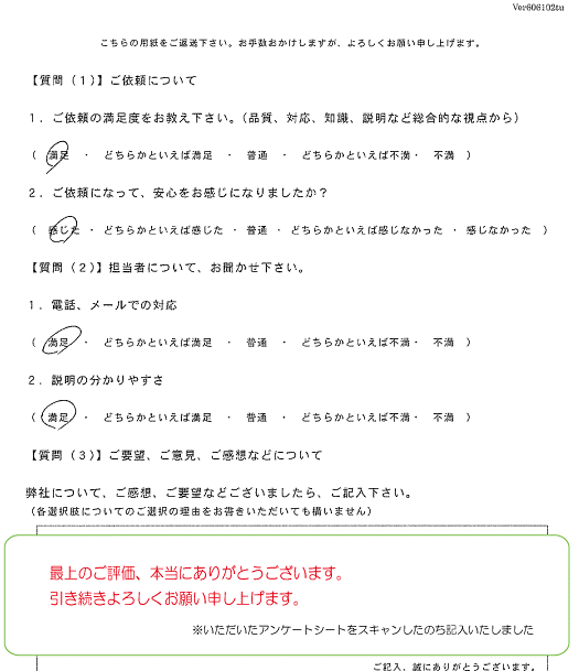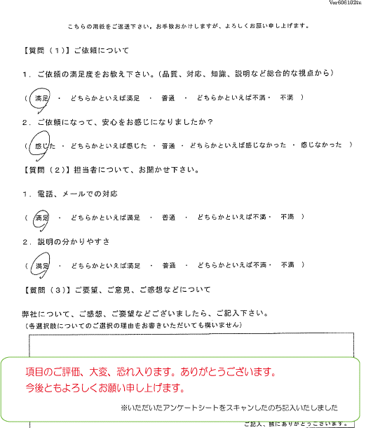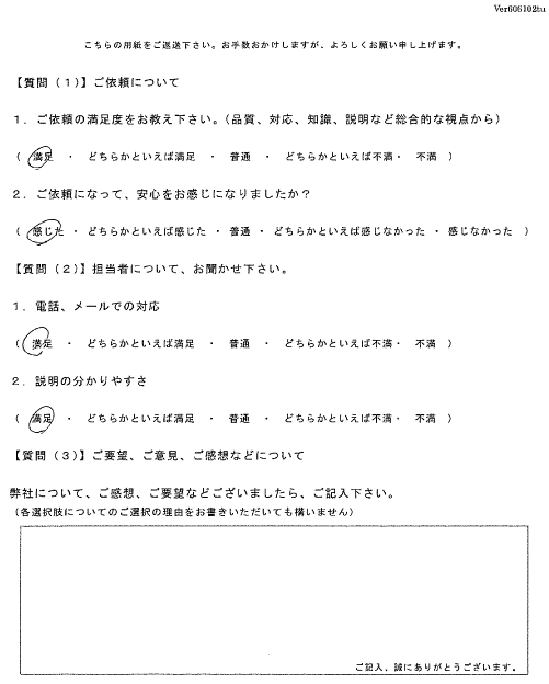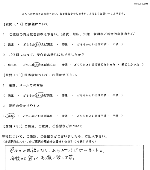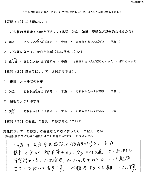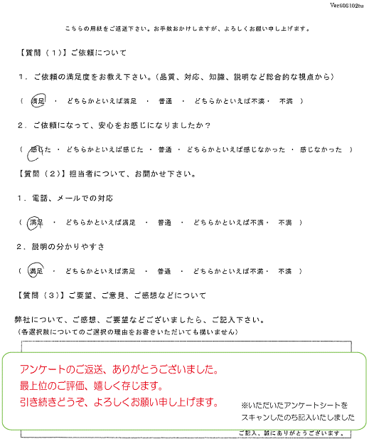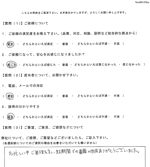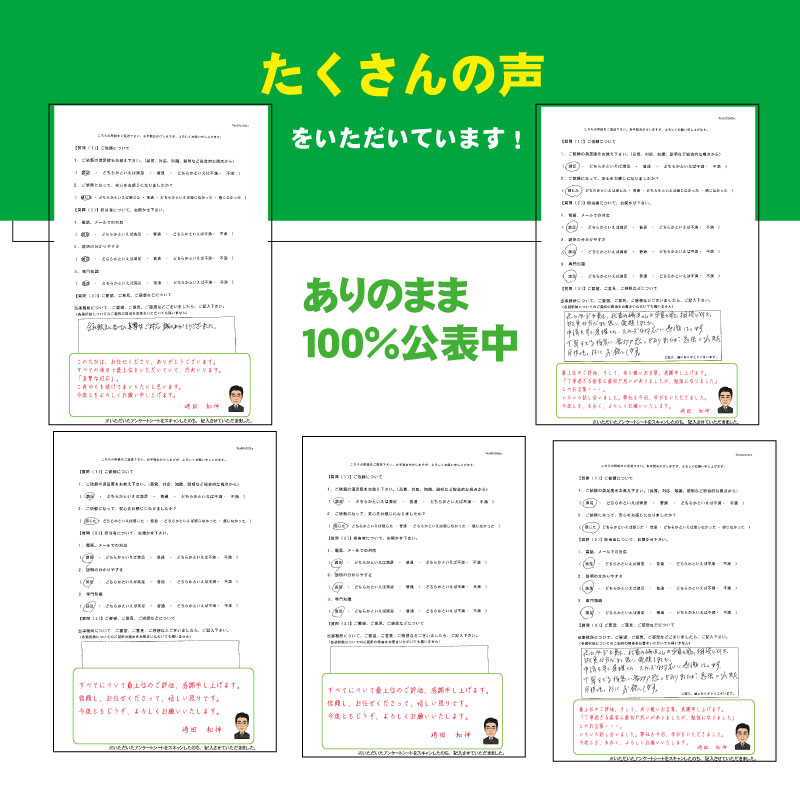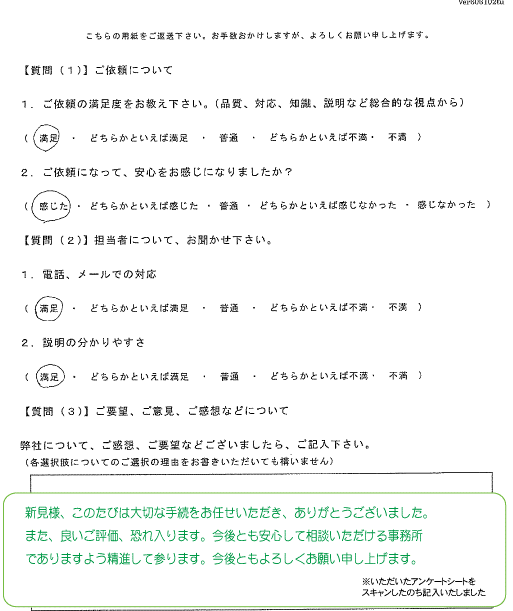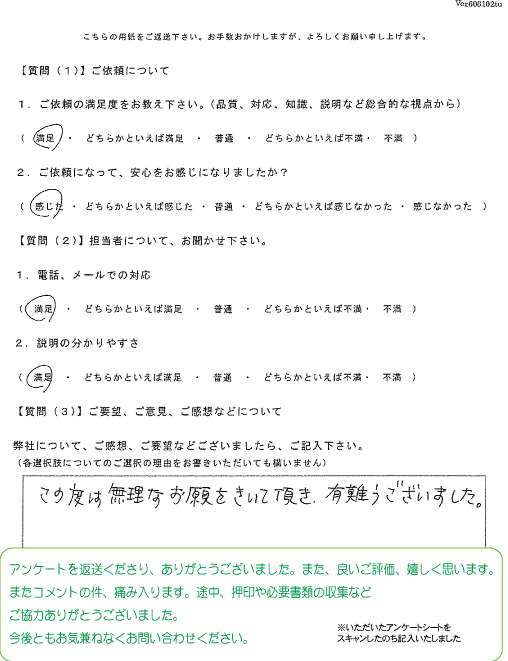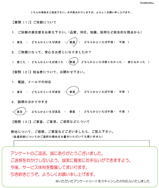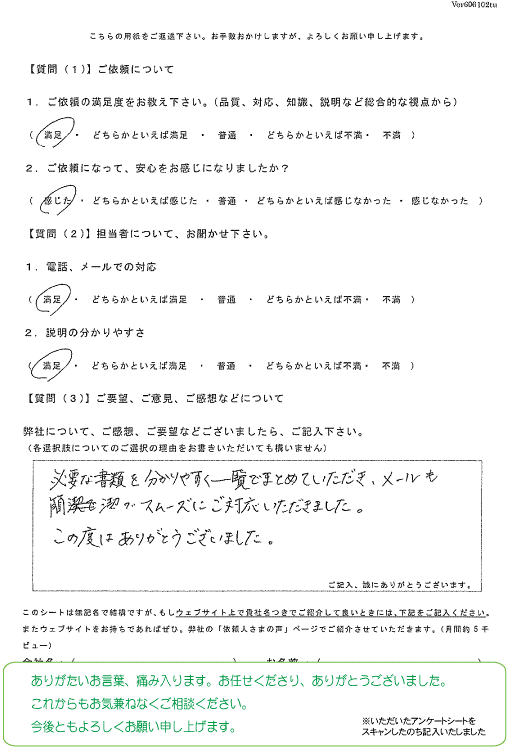 ご依頼完了後のアンケートです 良いご評価もそうでないご評価も公開しております 手続きが完了したあとに返送いただいたアンケートです。 良いご評価におごることなく、そうではないご評価に対しては、改善を継続してまいります。 ご依頼アンケート 大切な節目にご依頼くださり、ありがとうございます。