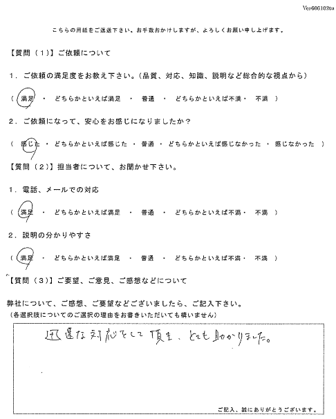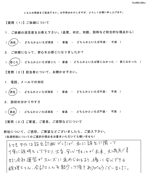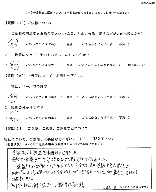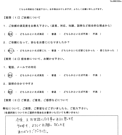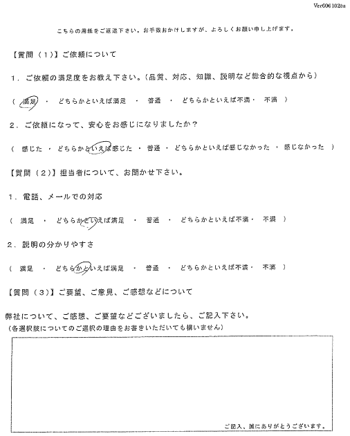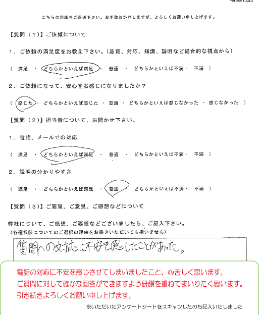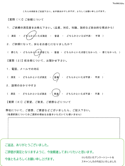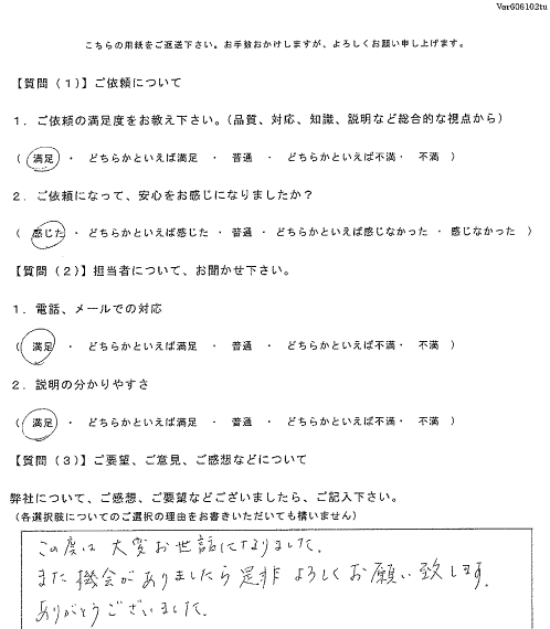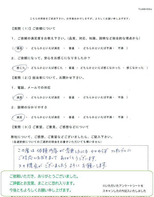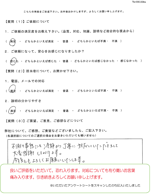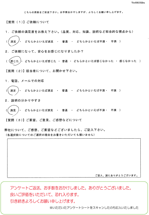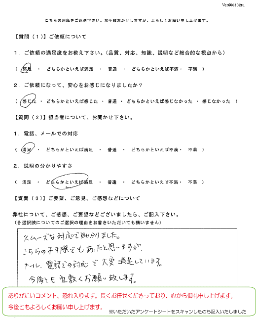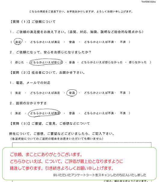 ご依頼完了後のアンケートです 良いご評価もそうでないご評価も公開しております 手続きが完了したあとに返送いただいたアンケートです。 良いご評価におごることなく、そうではないご評価に対しては、改善を継続してまいります。 ご依頼アンケート 大切な節目にご依頼くださり、ありがとうございます。